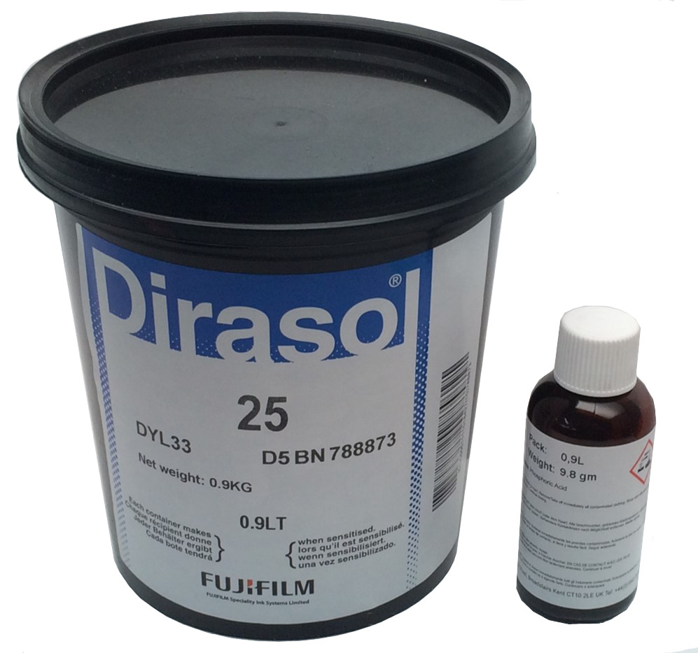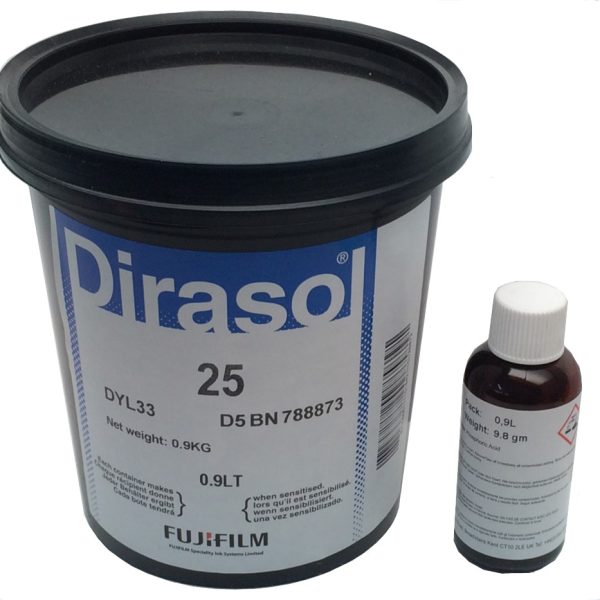 Dirasol 25 is a popular diazo photostencil emulsion for screen printing, specifically designed for T-shirts, sportswear, and fashion garments using water-based or plastisol inks, offering good detail, mesh bridging, and easy reclaimability,